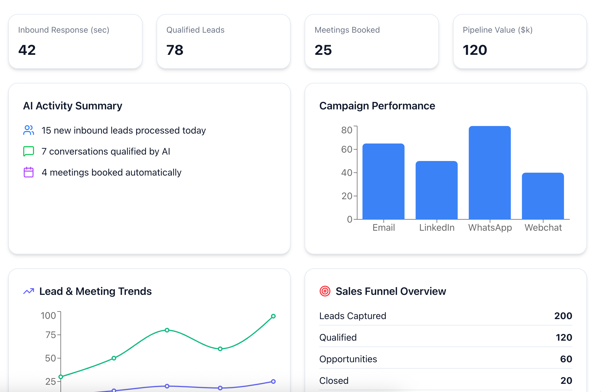 Be ahead of your competetor. Engage instantly 24X7 over Email, Whatsapp, Voice Call, Website enquiries, Chats, JustDial, Indiamart an many more. Get a birds eye view of your sales pipeline, team performance, leads progress and deal stages with revenue projections
